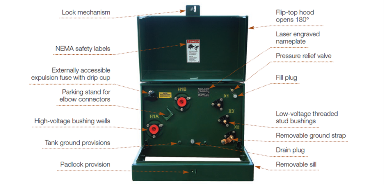 Premier Transformer single-phase pad-mounted distribution transformers are engineered with robust construction and proven reliability for residential, commercial, and utility applications. Each unit incorporates the following standard features: